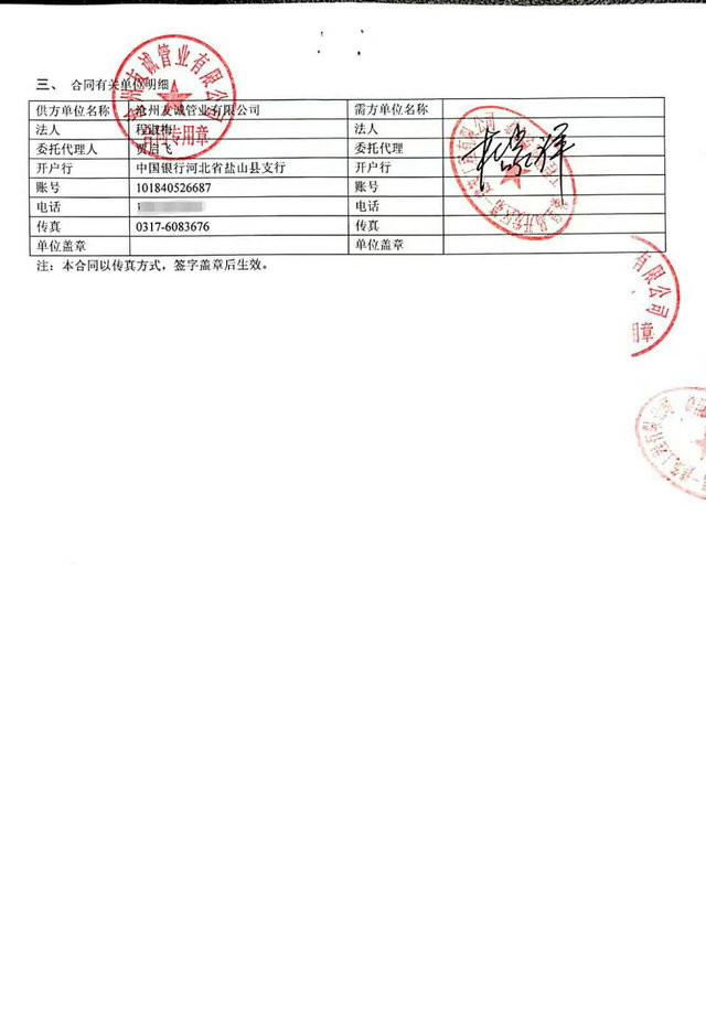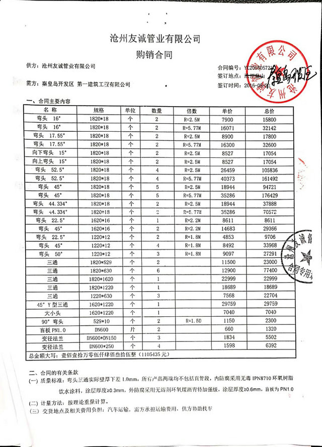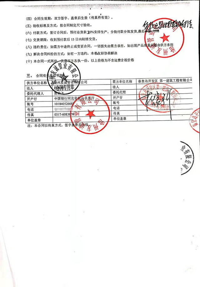 秦皇島開發區第一建筑工程有限公司與我公司,2016年簽訂秦皇島開發區引青供水工程項目防腐管道合同,我們已最優質的產品質量,順利愉快的完成了這次合作,感謝客戶對我們的信賴,我公司將一如既往再創輝煌
