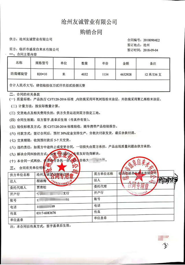 2018年9月我公司與沂州水務(wù)集團臨沂市盛泉自來水有限公司簽訂TPEP防腐螺旋鋼管購銷合同,DN800內(nèi)外防腐鋼管4000米,感謝張總的信任,與貴公司的合同讓我們公司在自來水管道領(lǐng)域有了一個新的突破,歡迎各界領(lǐng)域客戶前來合作