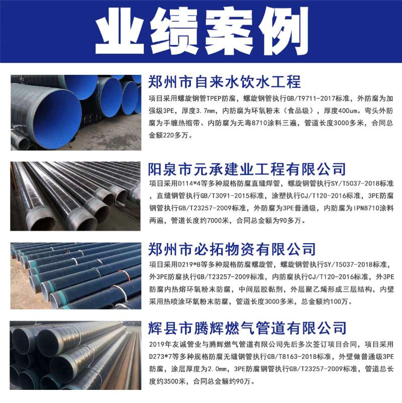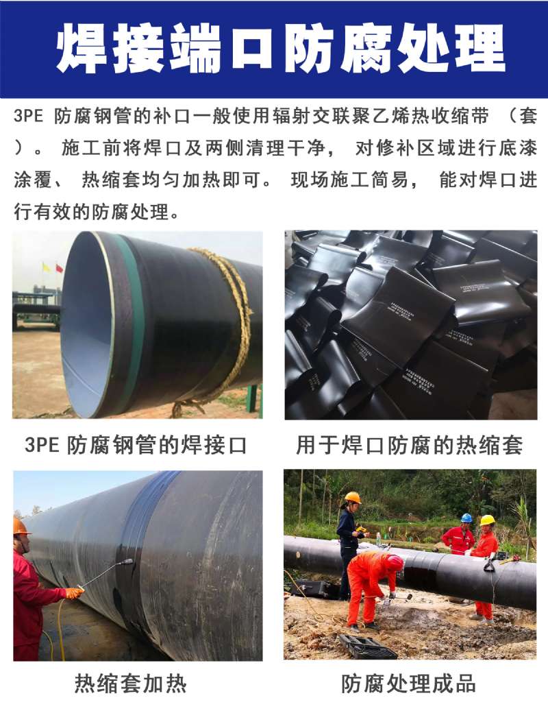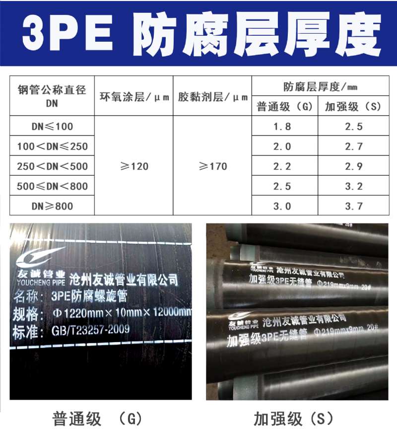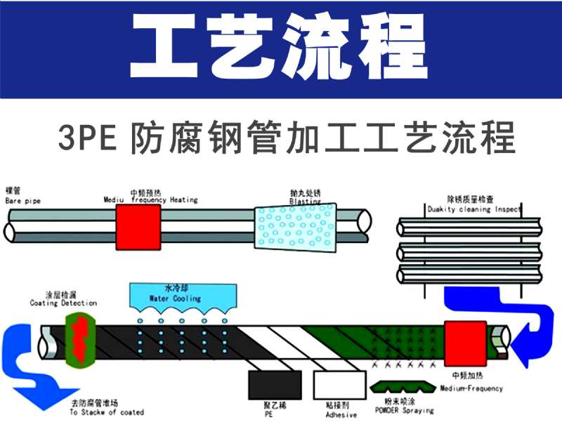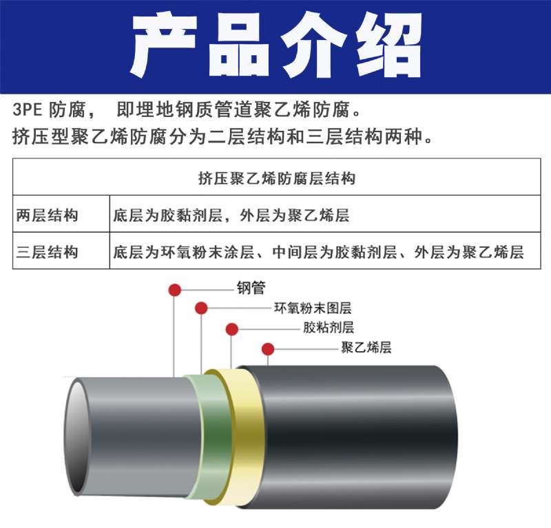 第一層環氧粉末(FBE>100um),第二層膠粘劑(AD)170~250um,第三層聚乙烯(PE)2.5~3.7mm。三種材料融為一體,并與鋼管牢固結合形成優良的防腐層。